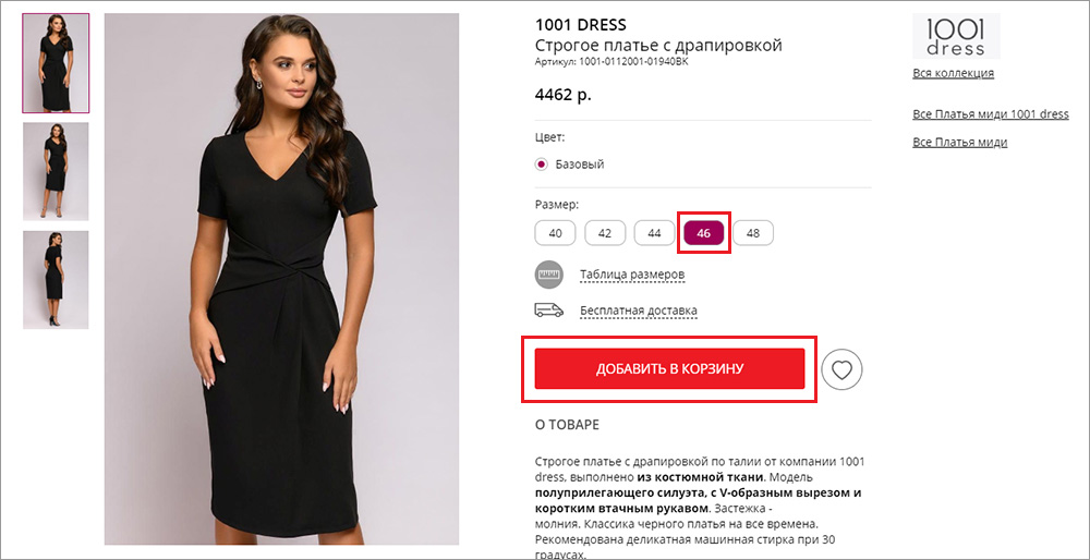 2. В Карточке товара выберите нужный вам размер и нажмите на кнопку «Добавить в корзину».