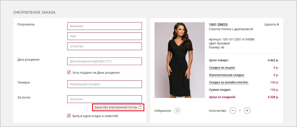 7. Если у вас по каким-то причинам нет электронной почты, нажмите «Заказ без электронной почты». Обращаем ваше внимание на то, что выбирая этот пункт, вы не сможете завести Личный кабинет на нашем сайте, в связи с чем лишаетесь возможности получать персональные скидки и участвовать в наших акциях и распродажах.
