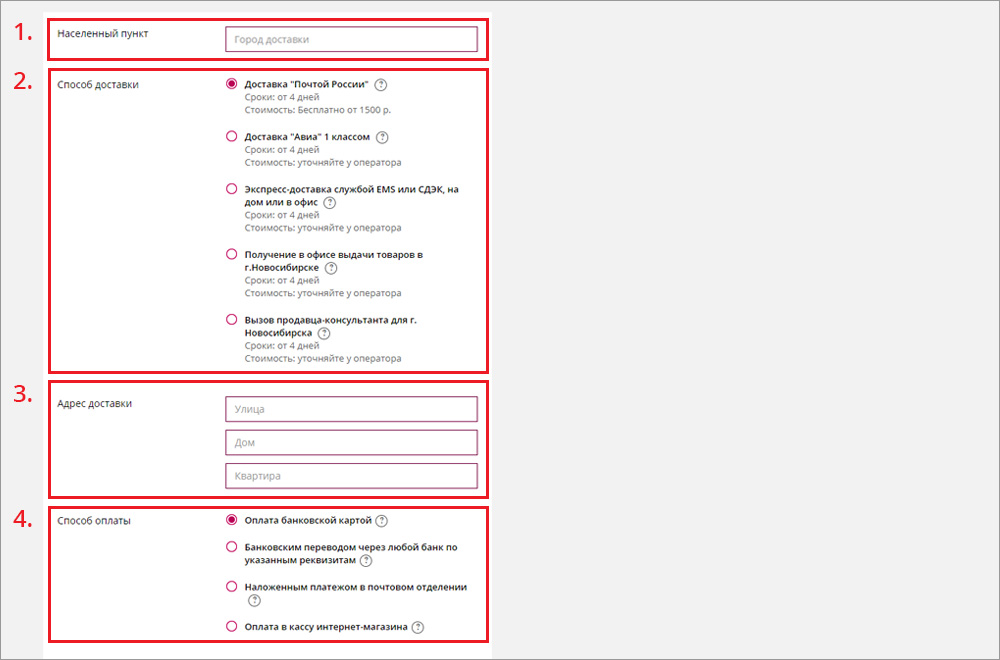 8. Заполните свои адресные данные, необходимые для служб доставки, и выберете способ доставки: